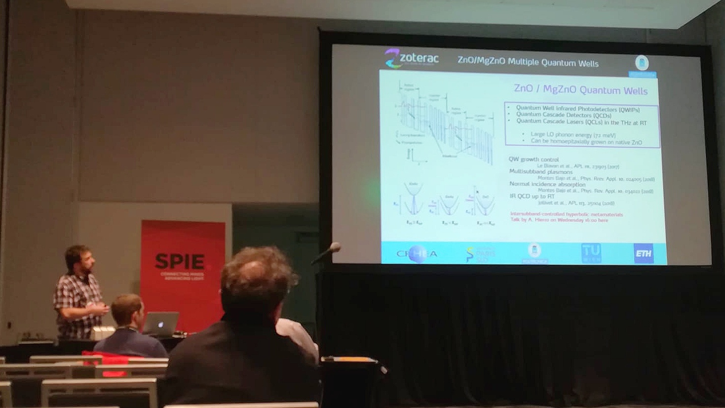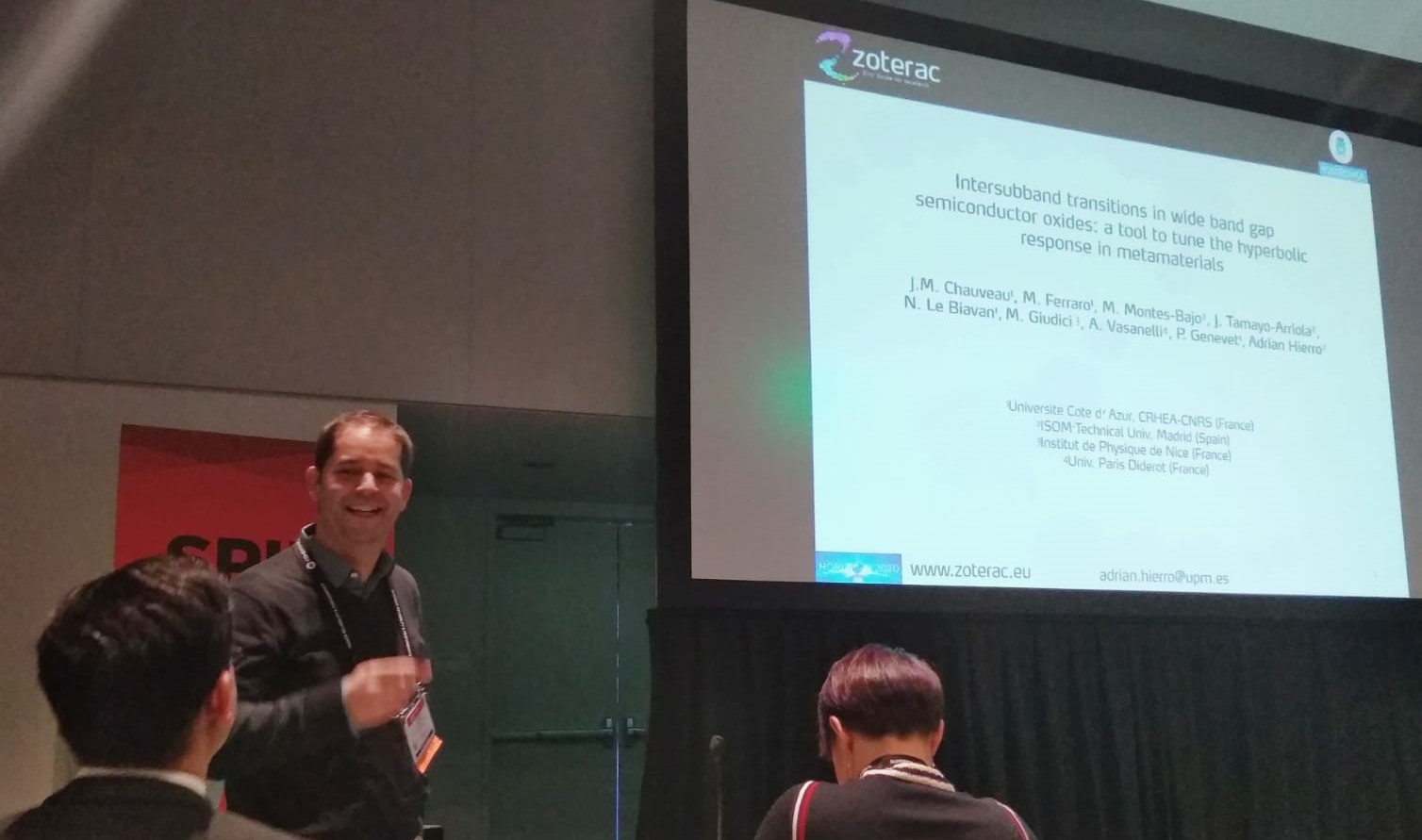 Miguel Montes gave the talk entitled "Interface phonon-polaritons as an all-optical technique to assess the Mg content in ZnO/MgZnO multiple quantum wells". Adrián Hierro presented "Using ZnO multiple quantum well metastructures for IR light polarization sensitive photodetection under normal incidence", and also talked about "Intersubband transitions in wide band gap semiconductor oxides: a tool to tune the hyperbolic response in metamaterials". F. H. Julien presented "Short infrared wavelength quantum cascade detectors based on m-plane ZnO/ZnMgO quantum wells".